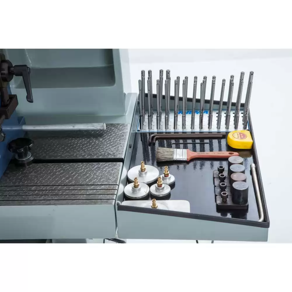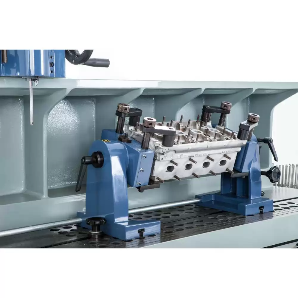 Possuí grapas individuais para a fixação do cabeçote de motor, com giro de 180°, assegurando a fixação de diversos tipos de cabeçotes sem dificuldades. A centralização da ferramenta é mais rápida, prática e precisa devido ao cabeçote flutuante sobre colchão de ar acompanhada do nivelamento com ajuste fino. Nas bandejas laterais os acessórios de trabalho estão à disposição do operador, de maneira organizada e acessível.